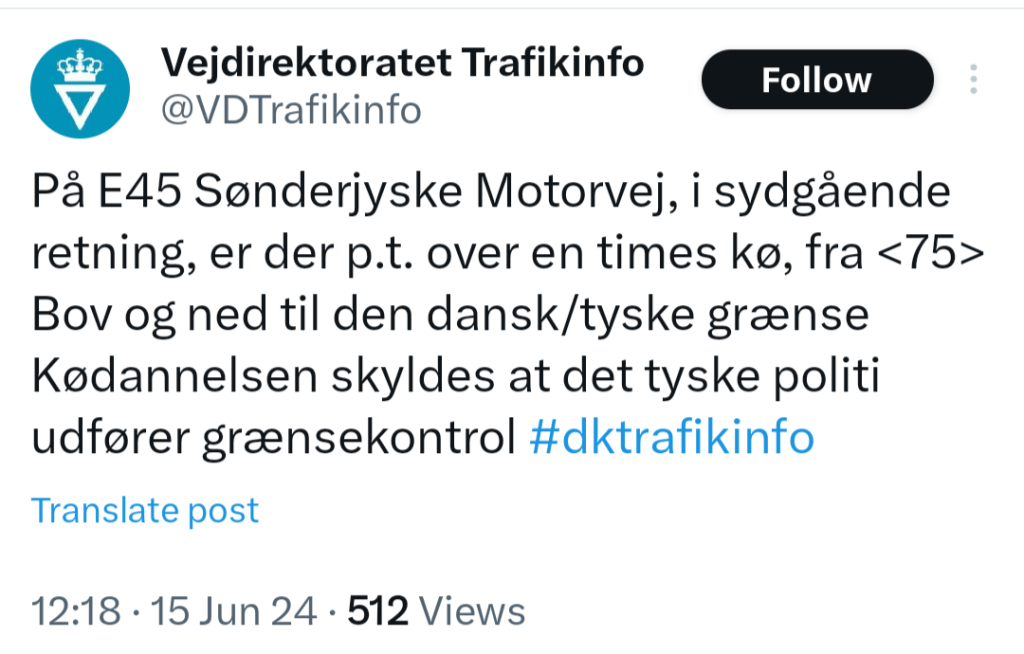 Det skyldes, at Tyskland har indført midlertidig grænsekontrol som ekstra sikkerhedsforanstaltning i forbindelse med EM i fodbold.